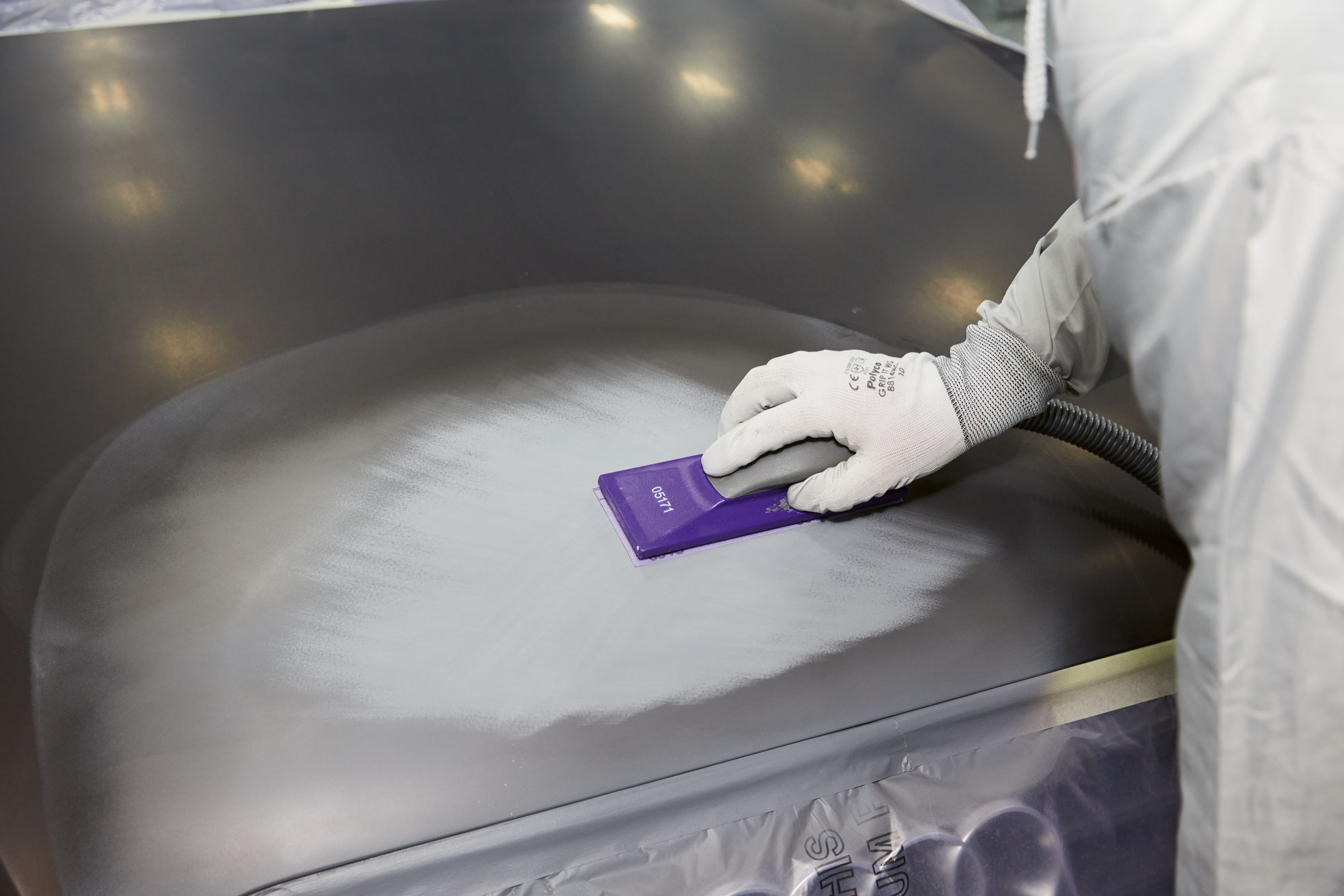 Mit dem 3M Hookit Purple+ Multihole Handblock lässt sich Spachtelmasse problemlos und wirkungsvoll schleifen.