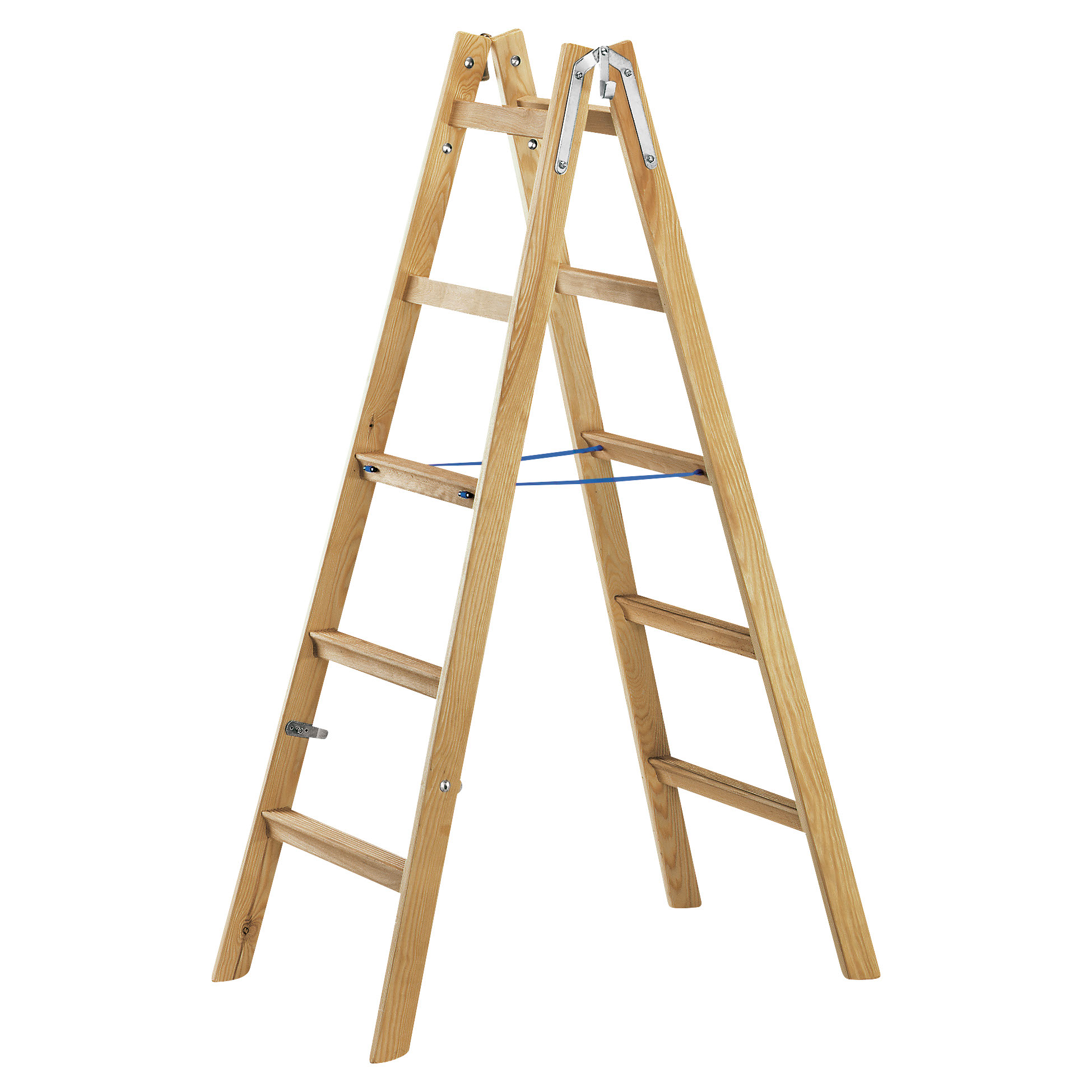 Holz, besonders robuste Verarbeitung mit verbreiterten Sprossen für angenehmen Stand. Hergestellt nach EN 131, GS-Zeichen.